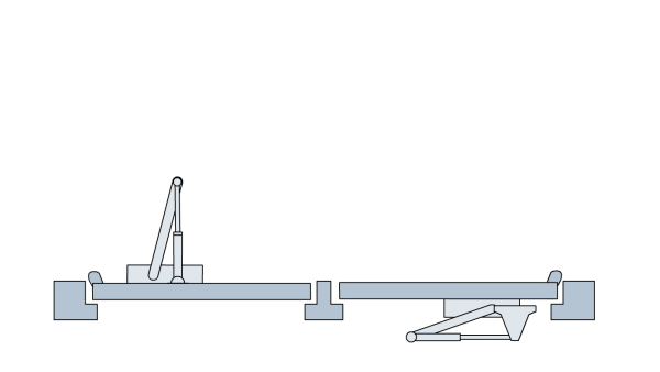 (2)原理:液压缓冲弹簧给联杆一个恢复力矩,使联杆向远离铰链的方向旋转,从而带动滑块在滑道内同时向远离铰链的方向移动,达到闭门的目的。滑道前端有一个临时锁定卡,当门扇打开到直角位置时,滑块移至接近铰链一侧,锁定卡卡入滑块前端的舌形槽内,使门临时锁定在这一位置上。